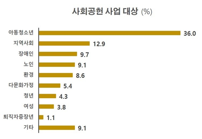 기업들이 사회공헌활동을 펼친 대상은 아동청소년을 위한 사업에 36.0%를 지출해서 가장 많은 금액을 미래를 짊어질 우리 아동과 청소년을 위해 지출했다.
