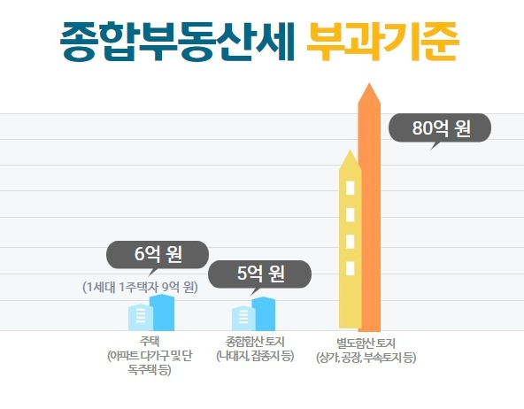 자산별 공제액은 주택의 경우 6억원이며, 1세대 1주택자의 경우에는 9억원이다. 나대지 등 종합합산 토지의 경우는 5억원이고, 상가·공장 등 별도합산토지는 80억원이다.