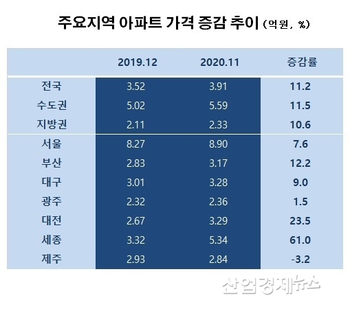 올해 들어 아파트값이 가장 많이 오른 곳은 세종시다. 지난해 말 세종시 평균 아파트값은 3억 3200만원이었지만 11개월 사이 61.0%나 올라 11월에 5억 3400만원으로 2억원이 넘게 올랐다. 세종시와 더불어 대전도 올해 23.5%나 올라 급격한 상승곡선을 그렸다.