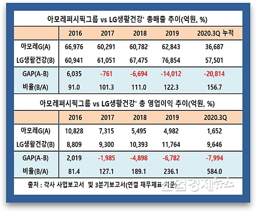 이로써 LG생활건강은 2017년 전체 외형(매출)에서 처음으로 아모레G를 761억 원 가량 앞선 이후 2018년 6694억, 2019년엔 1조4012억, 올 3분기엔 2조814억 원으로 격차를 더 벌린 데다 화장품 맹주에도 오르는, 뷰티史에 한 획을 긋는 대 파란을 일으켰다는 평가를 얻게 됐다.