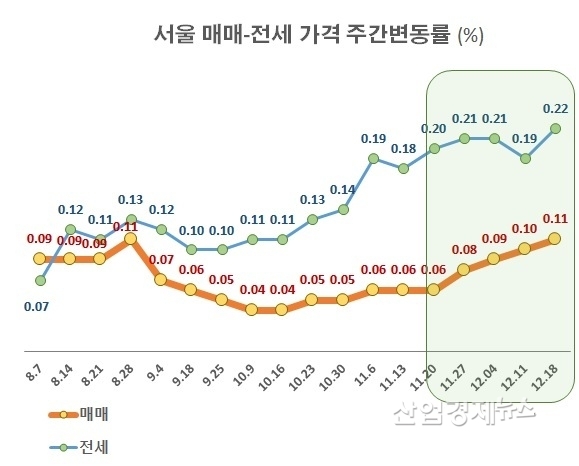 서울 아파트 가격은 12월 셋째 주 0.11%의 주간 상승률을 기록했는데 이러한 수치는 7월과 8월 정부의 고강도 부동산 대책이 발표될 때의 수준이다.