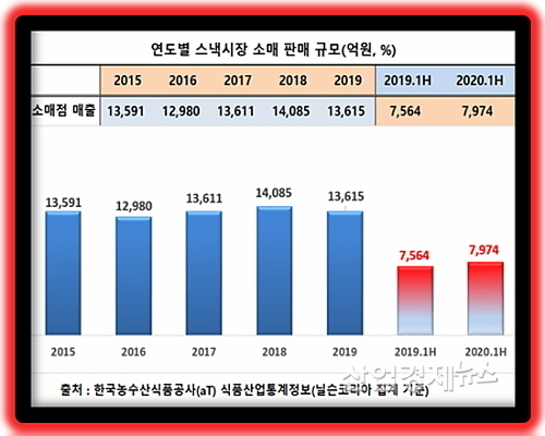그러면 지난 4년간 스낵류 소매판매액은 어떠한 궤적을 그렸고, 2020년 상반기 시장 규모는 전년도(2019년) 상반기대비 얼마나 늘었으며 또 업계에서는 어떤 승부수를 펼쳐왔을까?