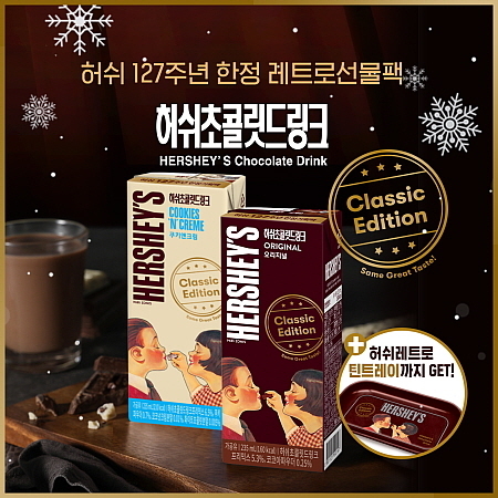이번 레트로 패키지는 허쉬 127주년을 기념한 것으로 ‘허쉬 오리지널 190ml’와 ‘허쉬 오리지널 235ml’, ‘허쉬 쿠키앤크림 235ml’ 3종 모두에 적용된다. 특히 100년 전 허쉬초콜릿에 사용되었던 그리운 빈티지아트를 그대로 적용함으로써 달콤한 맛에 레트로 감성을 더했다.
