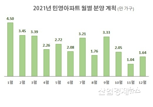 분양계획을 월별로 살펴보면, 1월에 4만4957 가구 등 1분기에 11만3400 가구가 분양 예정인 반면, 4분기에는 4만7220 가구에 지나지 않는다.