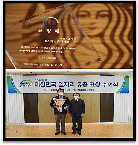 먼저 스타벅스는 지난 연말 청년 및 다양한 취약 계층의 일자리 창출 공로를 인정받아 대통령직속 일자리위원회가 수여하는 2020년도 대한민국 일자리 유공표창을 수상했다.