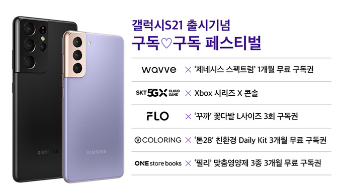 예약판매 개시일부터 2월 10일까지 갤럭시S21을 구매한 고객을 대상으로 추첨을 통해 645명에게 ▲제네시스 차량 구독 서비스 ‘제네시스 스펙트럼’ 1개월 구독(189만원 상당) ▲Xbox 시리즈X 콘솔 ▲친환경 바를거리 ‘톤28’ 3개월 구독 ▲맞춤영양제 ‘필리’ 3종 3개월 구독 ▲’꾸까’ 꽃다발 3회 구독 등 혜택을 제공한다.