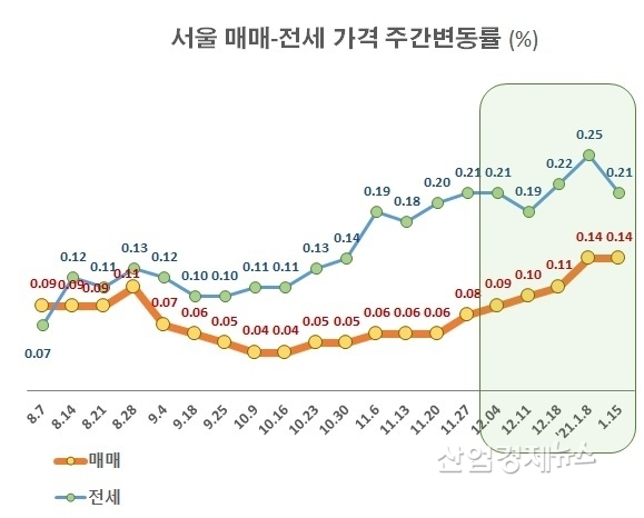 매주 수도권 아파트가격을 조사하고 있는 부동산114에 따르면 지난해 12월 주간변동률이 0.10%를 넘어선 서울 아파트 가격은 올해로 들어 오면서 0.14%로 상승률이 한 단계 더 높은 곳으로 올라섰다.