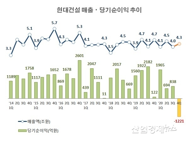당기순이익은 1221억원 적자를 기록했다. 현대건설 실적으로는 좀처럼 보기힘든 손실이 발생했다.