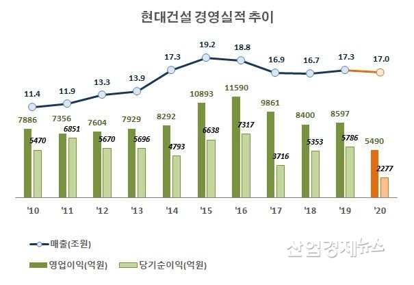 현대건설의 2020년 연간실적은 매출 16조 9709억원, 영업이익 5490억원, 당기순이익 2277억원으로 잠정 발표됐다.