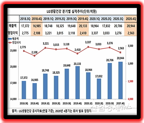 LG생활건강이 밝힌 연결재무제표 기준 2020년 4분기 잠정실적(IR자료)에 따르면 회사 전체 매출은 2조944억 원으로 전년 동기 2조133억 대비 811억 원이 늘어 약 4,0% 증가하며, 직전 분기에 기록했던 역대 분기매출 최대치를 갱신하는 선전을 펼쳤다.