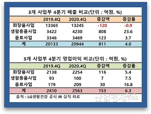 4Q사업부별 실적, ‘생활용품·음료’ 호조...최대 분기 매출 견인...화장품 손익 증가세로 반전