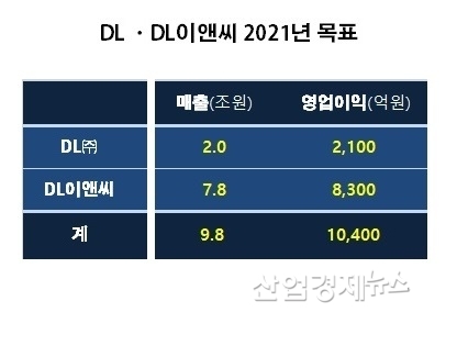 한편, DL㈜와 DL이앤씨는 지난해 실적과 함께 분할 이후 2021년 경영목표를 각각 제시했다. DL(주)는 올해에 매출 2조원, 영업이익 2,100억원을 목표로 설정했고, DL이앤씨는 매출액 7조 8천억원, 영업이익 8,300억원, 신규수주 11조 5천억원을 목표로 제시했다.