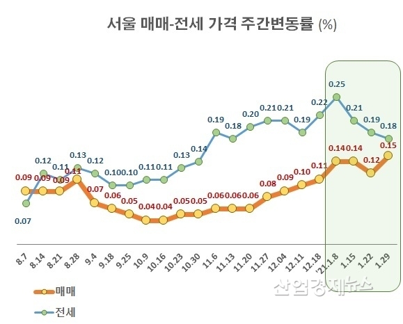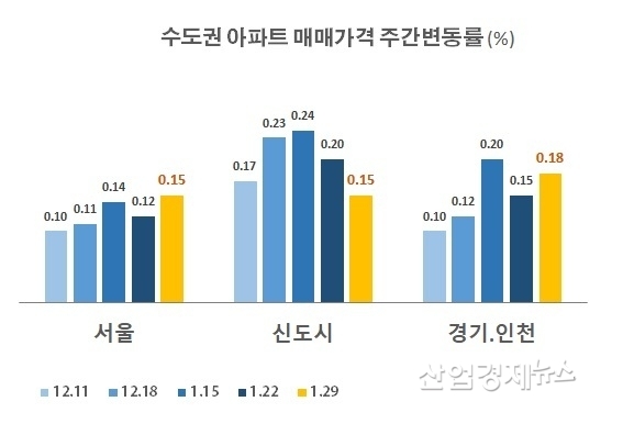 부동산114가 조사한 수도권 아파트 가격의 주간 변동률에 따르면, 지난 1월 마지막 주 서울 아파트의 매매 가격은 0.15%의 상승률을 보였다. 이러한 주간 상승률은 지난 11년 사이 최고 상승률이다.