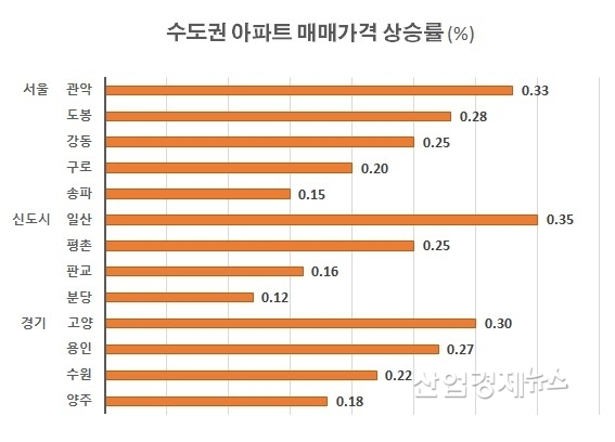 수도권 아파트의 지난주 상승폭은 지역별로 다소 차이를 보였다. 서울은 1월 넷째 주 0.12%에서 0.15%로 크게 늘어난 반면, 그동안 높은 상승세를 보였던 신도시는 1월 중순 0.24%를 최고점으로 지난주 0.15%까지 떨어졌다. 서울 상승폭과 동일한 수준이다.