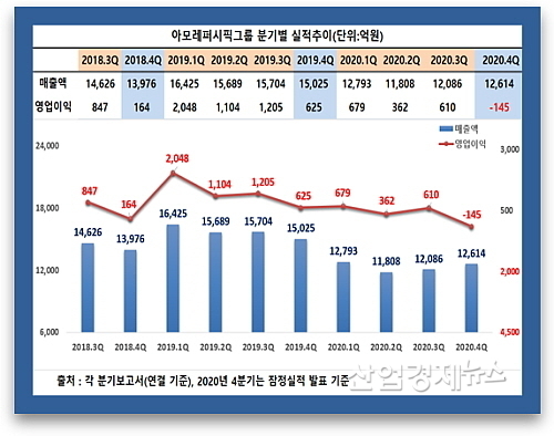 아모레G가 최근 공시한 잠정 영업실적에 따르면 연결재무제표기준 지난해 4분기 매출은 1조2614억 원으로, 지난해 4분기 1조5025억 대비 2411억이 줄어 약 16.0% 감소했다.