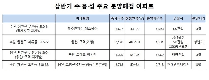 부동산시장 분석업체 부동산인포에 따르면 올해 수‧용‧성 지역에 총 2만3033가구(임대, 오피스텔 제외) 중 조합원 물량을 제외한 1만7965가구가 일반분양 될 예정이다. 지난 해 공급됐던 일반분양 1만5739가구보다 2226가구가 더 늘어난다.