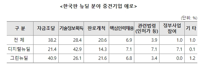디지털 뉴딜 분야 중견기업은 차세대 반도체 등 기술 경쟁력 제고를 위한 ‘기술 정보 획득(42.9%)’, 태양광·풍력, 수소·전기차 등 신규 시장 진출을 모색하는 그린 뉴딜 분야 중견기업은 ‘자금 조달(40.9%)’을 가장 큰 애로 사항으로 지목했다.