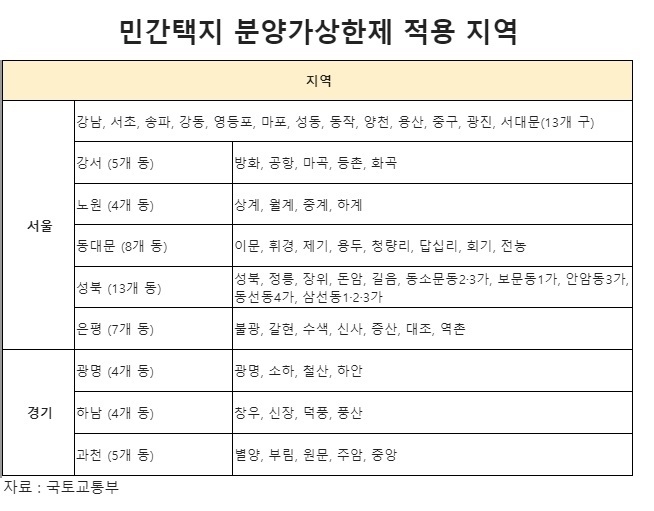 경기도에서는 △과천시 별양동, 부림동, 원문동, 주암동, 중앙동 △하남시 창우동, 신장동, 덕풍동, 풍산동 △광명시 광명동, 소하동, 철산동, 하안동 등이 민간택지 분양가상한제가 적용되는 지역이다. 인천은 적용 지역이 없다.
