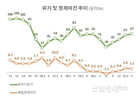 유가는 60달러 대를 넘어 지난 8일 브렌트유 기준 71.4달러까지 올랐고, 정제마진도 지난 2월말에는 2.8달러를 찍기도 했다.