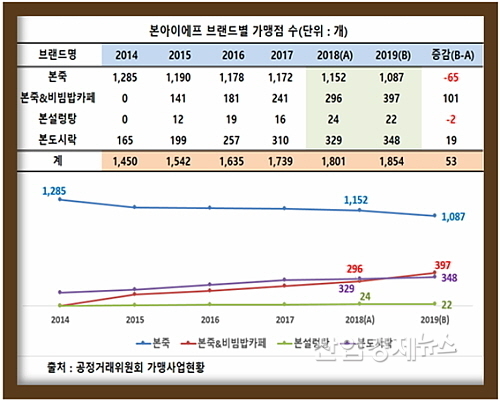 전년대비 가맹점수, ‘본죽·본설렁탕은↓, 본죽&비빔밥·본도시락은 ↑’..‘희비’