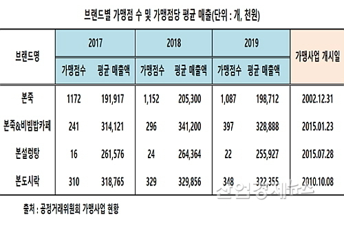 공정거래위원회 가맹사업현황에 따르면 지난 2019년 기준 본죽, 본죽&비빔밥카페, 본설렁탕, 본도시락 등 4개 브랜드 가운데 가맹점당 평균 매출이 가장 많은 곳은 본죽&비빔밥카페로 가맹점 1곳당 평균 3.28억 원의 연매출을 올린 것으로 나타났다.