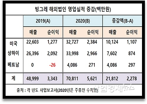 미국, 상하이, 베트남 등 해외법인 3사 매출이 2019년 489.9억 대비 218.1억이 급증한 708.1억을 시현한데다, 본사 역시 351억 가량 순증하며 창사 최대 매출 시현에 골고루 힘을 보탰다.
