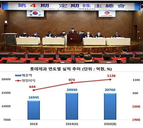 또 이사 선임의 건에서는 사내이사에 이영구 롯데그룹 식품BU장이 새로 선임됐고, 사외이사에는 김종준, 나건 이사가 재선임되었으며 손문기 이사가 신규 선임되었다.