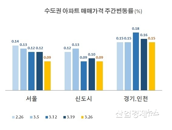 신도시 지역은 3월 초까지는 상승률이 0.13%를 기록하며 상승세가 커졌었지만 이후 0.09~0.10%를 유지하고 있고, 경기인천 지역은 3월 중순에 0.18%로 반짝 상승세를 보였지만 최근 두 주 사이에는 이전 수준으로 줄어들어 지난 주에는 0.15%의 상승률을 보였다.