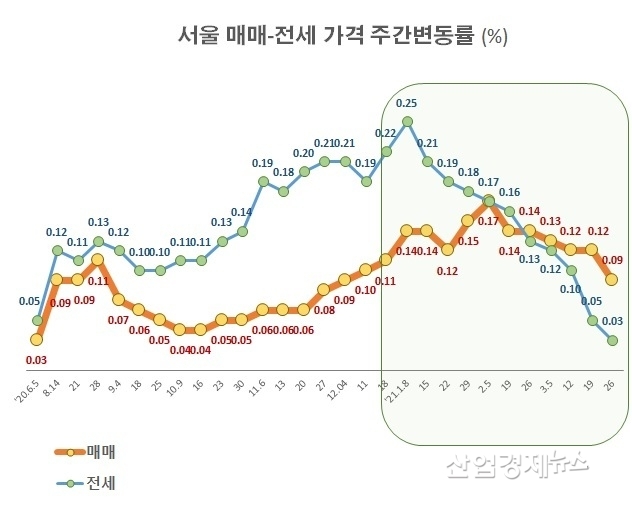 지난 2월 마지막 주에 전세가격 상승률과 매매가격 상승률이 0.13%로 같은 수치를 기록한 후, 매매가격 상승률은 보합세를 유지한 반면, 전세가격 상승률은 계속 하락했기 때문이다.