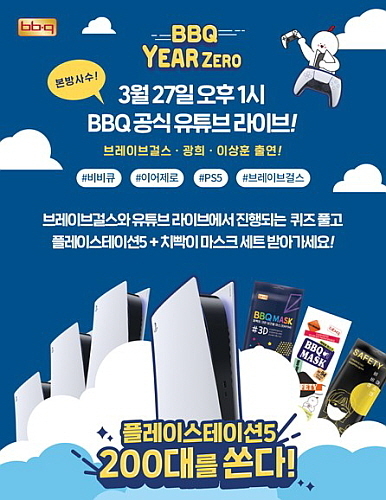여기에 스페셜 게스트로 대세 아이돌 브레이브걸스가 출연해 축하무대와 함께 퀴즈 이벤트를 진행, 본방을 사수하는 실시간 댓글 참여자 중 추첨을 통해 플레이스테이션5와 BBQ 마스코트 치빡이가 새겨진 마스크(KF94) 세트를 증정한다.