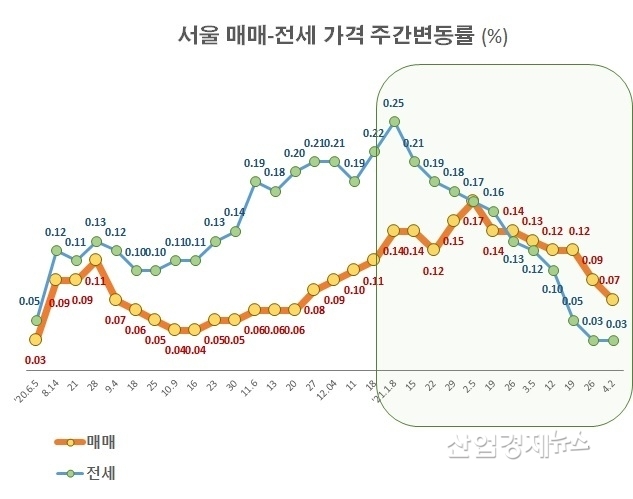 서울의 전세값 추이를 보면, 임대차3법이 통과된 지난해 9월 이후 0.20%를 넘으며 0.25%까지 사상 최고를 기록했던 주간변동률이 3월로 들어서면서 매주 큰 감소세를 보이다가 지난 주에는 0.03%까지 줄어 들었다.