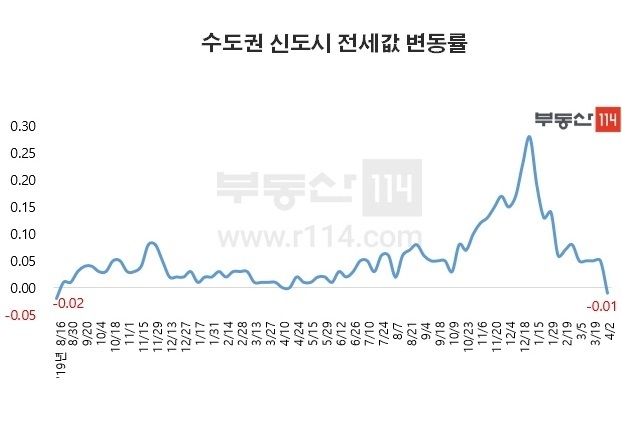 부동산 포털 사이트 부동산114가 지난주 수도권 집값 동향을 조사한 자료에 따르면, 위례, 동탄, 김포한강, 평촌 등 수도권 신도시의 전세가격 변동률이 마이너스를 보이며 하락한 것으로 나타났다.