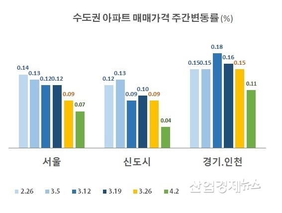 3월 마지막 주 0.09% 상승률을 보였던 서울은 지난 주 0.07%로 감소했으며, 0.09%를 보였던 신도시는 0.04%로, 0.15%를 보였던 경기인천 지역은 한 주만에 0.11%로 주간 상승률이 줄었다.