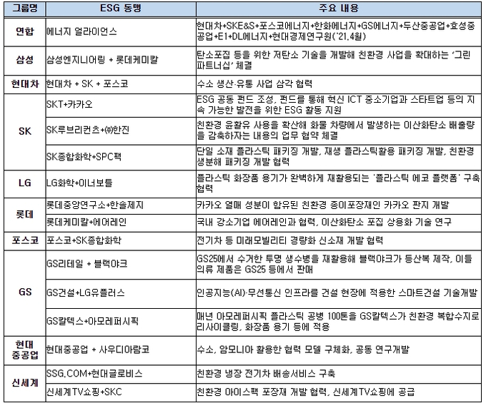 GS건설과 LG유플러스는 산재예방을 위한 스마트건설 기술 개발에 나선다. SK텔레콤과 카카오는 ESG 공동 펀드를 조성한다. 이 펀드를 통해 혁신 정보통신기술 중소기업과 스타트업 등의 지속 가능한 발전을 위한 ESG 활동을 지원할 계획이다. 롯데중앙연구소와 한솔제지는 카카오 열매 성분이 함유된 친환경 종이포장재인 카카오 판지를 공동 개발한다.