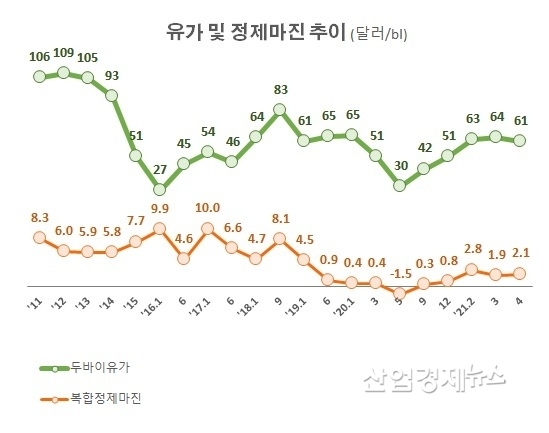 업계에 따르면 국제유가는 코로나19 재확산, 이란 핵 협상 재개에 따른 공급증가 우려로 두바이유 기준, 지난달 64달러보다 하락해 14일 현재 배럴당 61.5달러를 기록했다.
