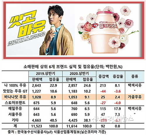 아울러 지난해 상반기 기준 판매액 상위 6개 브랜드 중 가공우유는 빙그레의 ‘바나나맛우유’뿐이고 나머지는 모두 흰색우유 제품이다.