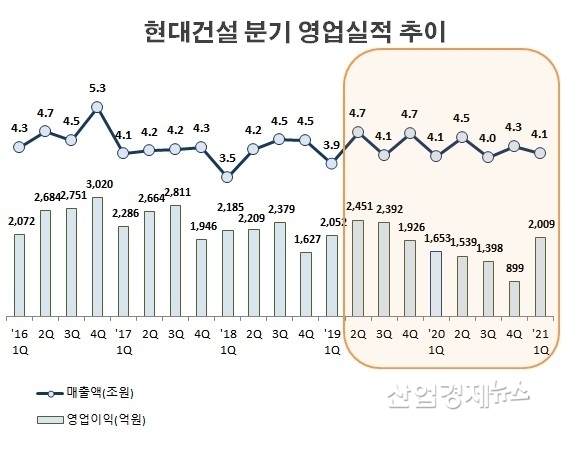 현대건설은 지난 23일, 2021년 1분기 잠정 영업실적을 시장에 공시했다. 공시에 따르면 매출은 4조 1496억원, 영업이익은 2009억원, 당기순이익 1944억원을 실현했다.