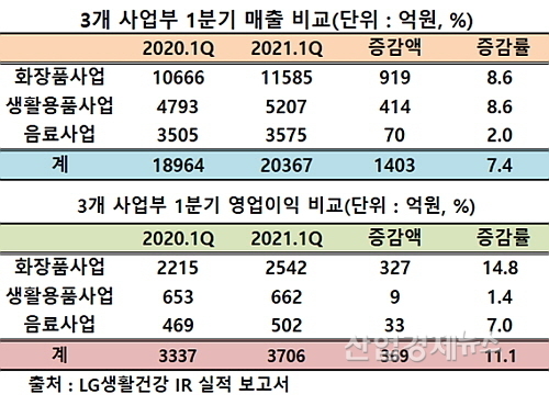 LG생활건강 관계자는 “코로나19로 국내외 시장 모두 어려운 경영환경이 지속됐지만 뷰티, HDB(생활용품), Refreshment(음료) 3개 사업 모두 매출과 이익이 성장하며 사상 최대 1분기 실적을 실현했다”고 설명했다.