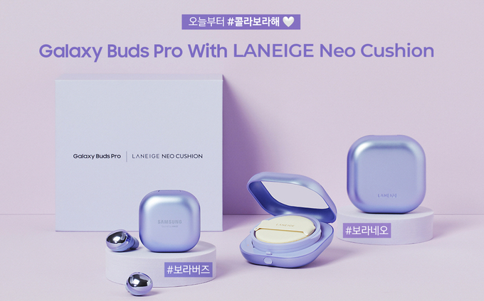 '갤럭시 버즈 프로 with 라네즈 네오 쿠션 콜라보라해' 패키지는 팬텀 바이올렛 색상의 '갤럭시 버즈 프로'와 아모레퍼시픽의 뷰티 브랜드인 라네즈의 인기 쿠션 파운데이션 '라네즈 네오 쿠션'으로 구성됐다.