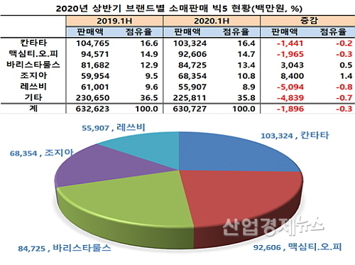 이중 상위 5개 브랜드의 성적을 살펴보면 1위는 롯데칠성음료의 ‘칸타타’로 지난해 상반기 1033억을 팔아 전년 동기 1047억 대비 14억 정도 줄었고, 2위 동서식품의 ‘맥심티.오.피’ 역시 926억 원 판매에 그쳐 전년대비 19.6억 가량 감소하는 부진한 성적을 기록했다.