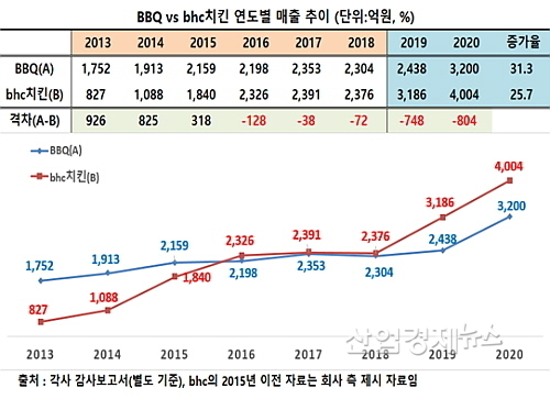 양사 감사보고서(별도재무제표 기준)에 따르면 업계 2위 bhc치킨의 지난해 매출은 4004억 원을 시현, 전년도 3186억 대비 818억이 늘어 25.7% 신장해 사상 최대치를 기록했다.