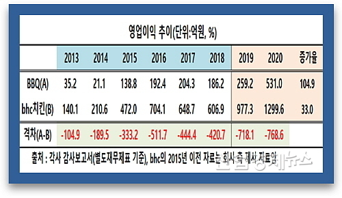 bhc치킨이 지난해 1299.6억 원의 영업이익을 시현 전년대비 33.0% 신장한데 반해, BBQ는 지난해 531억 원의 영업이익으로 전년도 259.2억 대비 무려 104.9% 급증한 어닝서프라이즈를 시현했음에도 그 격차가 더욱 벌어진 것.