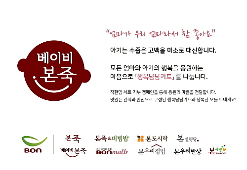 착한맘 세트는 영유아 개월수에 따라 A·B세트, 키즈 전용 C세트, 엄마아빠 전용 D세트 등 4종이며, 기간 내 베이비본죽 홈페이지에서 세트를 구입하면 기부에 자동 참여된다.