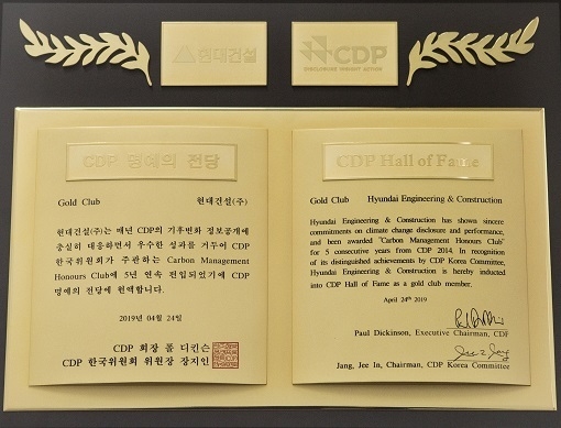 현대건설은 글로벌 환경경영 인증기관인 ‘탄소정보공개 프로젝트(Carbon Disclosure Project, CDP)’ 한국위원회가 발표한 ‘2020 CDP Korea 명예의 전당’에 3년 연속 입성하는 쾌거를 이뤘다.