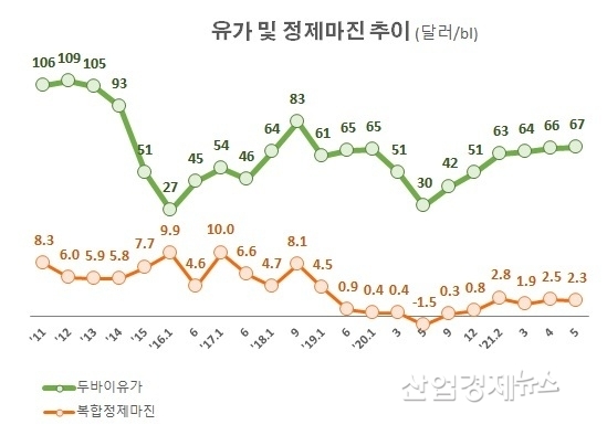국제유가와 정제마진 추이를 보면 지난해 5월 배럴당 30달러까지 떨어졌던 국제유가는 올해 들어와 60달러를 넘어서면서 2배 넘게 상승했다. 정유사들의 재고관련 이익이 크게 늘어난 이유다.