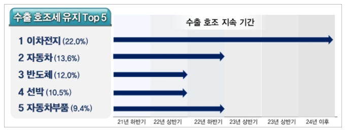 전국경제인연합회(이하 전경련)가 국내 12개 증권사 리서치센터장들을 대상으로 국내 주요 수출품목에 대한 앞으로의 전망을 조사할 결과, 이차전지, 자동차, 반도체, 선박, 자동차부품 등은 내년까지 수출 호조세가 전망되는 반면 컴퓨터, 석유화학, 디스플레이, 바이오․헬스, 가전 등은 올해 하반기에 수출 호조세가 꺾일 수 있다는 전망이 나왔다.