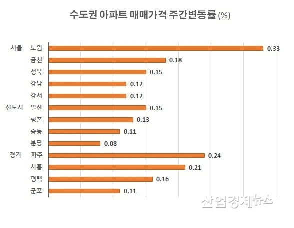 경기도에서는 GTX 등 교통호재를 갖고 있는 파주와 시흥이 각각 0.24%, 0.21%로 올라서 서울 금천구 다음으로 높은 상승세를 보였다. 이들 지역 아파트는 100~500만원 상승했다.
