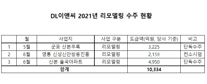 DL이앤씨는 지난 5월 산본 우륵아파트 리모델링 사업을 수주하며 리모델링 시장에 복귀했다. 이달 5일 수원 영통 신성신안쌍용진흥아파트에 이어 이번 사업까지 연이어 수주에 성공하면서 복귀 후 2달도 안되는 기간 동안 1조 334억원의 리모델링 수주를 달성했다.
