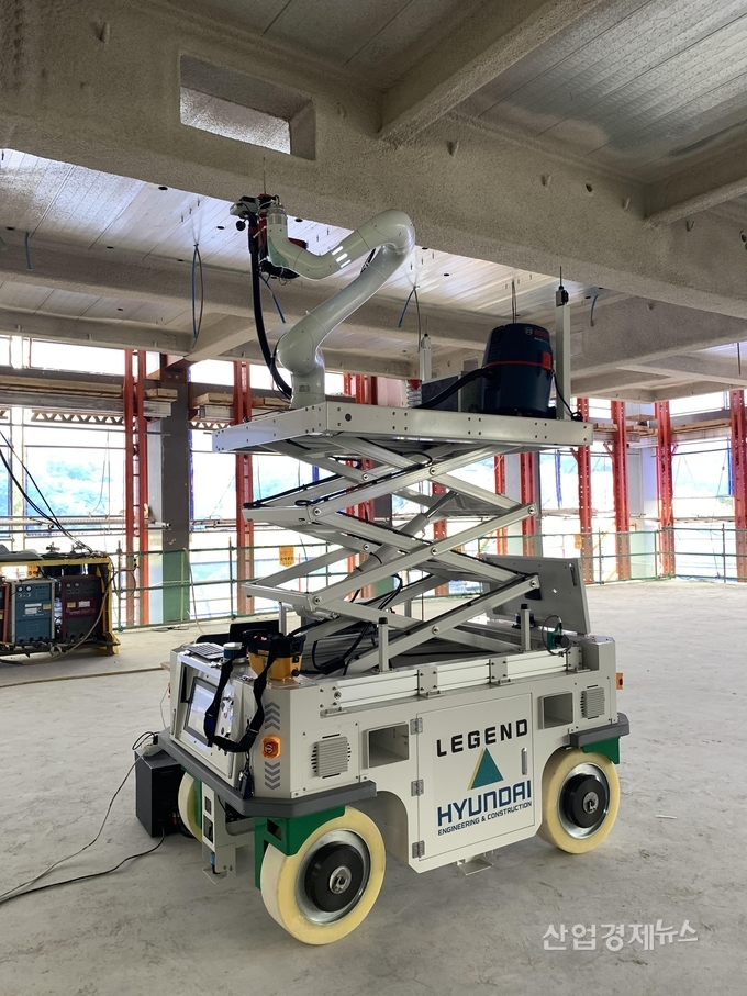 이날 무인시공 로봇은 근로자가 보호장구를 착용하고 리프트에 올라가 했을 천장드릴 타공 작업을 대신 수행했다.