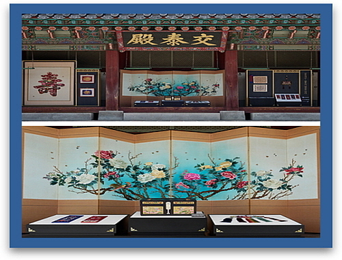 우선 왕실 여성의 공간인 교태전으로 들어서면 아름다운 정성으로 수놓은 ‘환유 국빈세트 궁중 자수함’이 눈길을 사로잡는다.